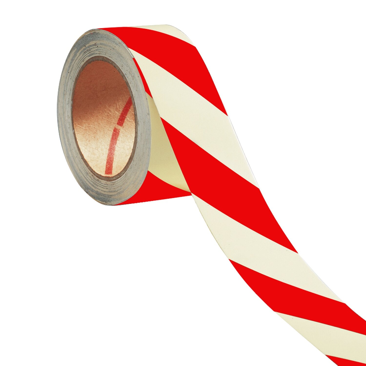 Waarschuwingsmarkering band, lang na-lichtend 50mmx16m rood/lux-wit, 2 rollen (1x rechts en 1x links wijzend) zelfklevend.